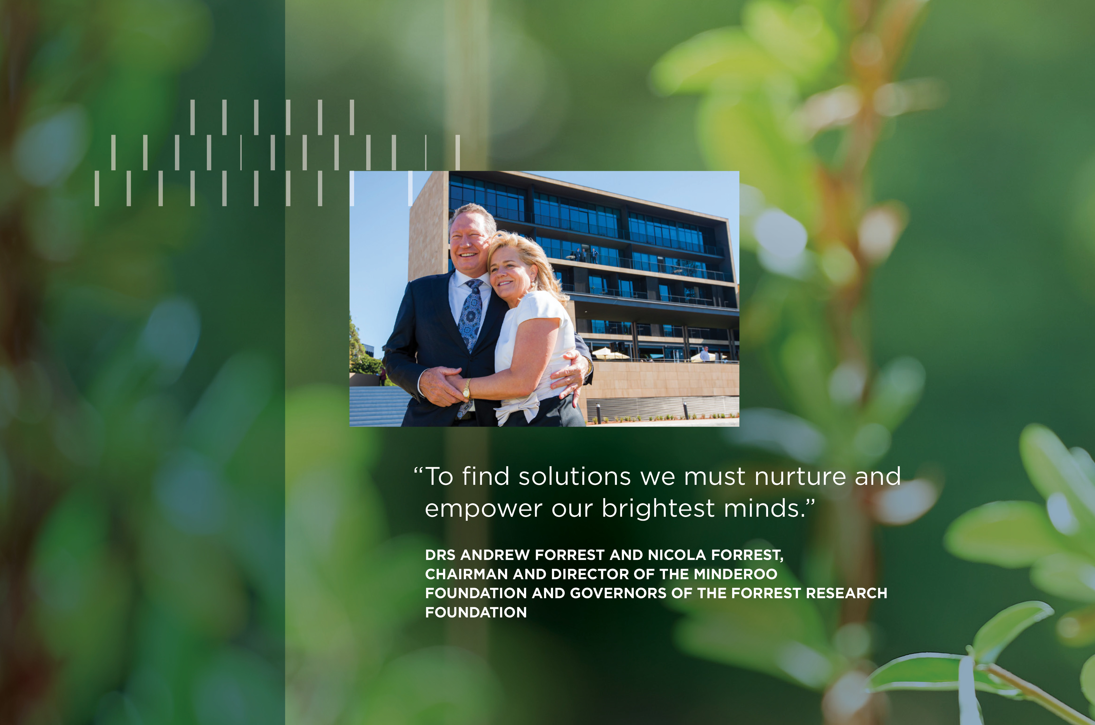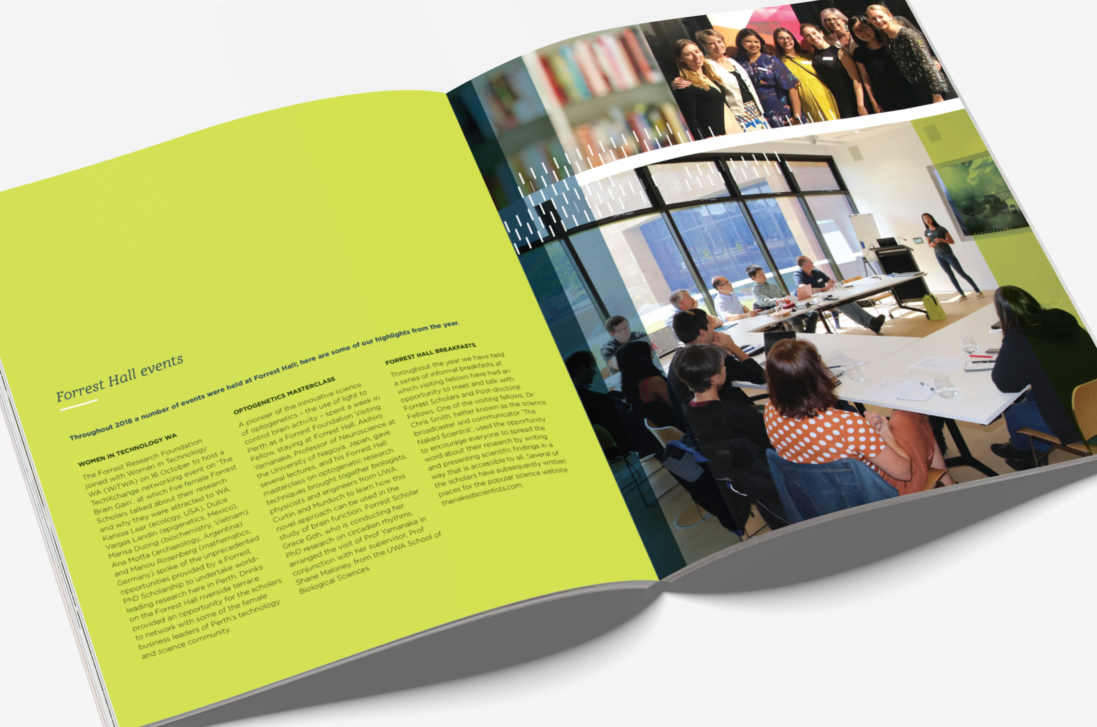 The new branding for Forrest Hall was designed with elements of the contemporary buildings’ architecture in mind. This branding was then rolled across the Forrest Research Foundation Annual Report, flyers, stationery, digital screens, social media and a style guide.
